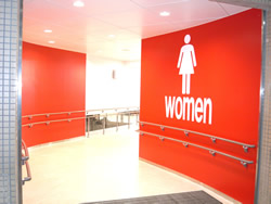 女性用トイレがわかりやすいように、入口の壁を赤く目立つようにしました(三芳PA)