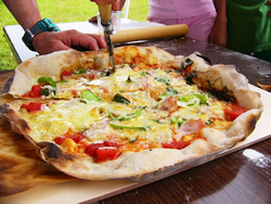 ライ麦ベースの生地を使用し、マルゲリータ風とカンツォーネ風ピザを作るのが「石窯でピザ」。粉をこねて発酵させ、生地を伸ばしてトッピング。講師料、保険料、材料費込みでひとり3465円(一般)。南乗鞍キャンプ場で開催。