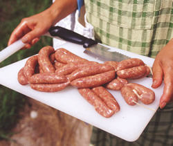 手作りウインナー教室は、粗挽きにした豚肉に各種スパイスを加えて羊腸に詰めて完成。講師料、保険料、材料費込みでひとり2541円(一般)。カンパーニャ嬬恋キャンプ場、津南キャンプ場で開催。