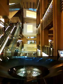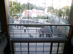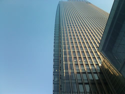 ひとりで見ていたときは「なんだかバランスが悪いな」と漠然と思っていたのだが、それにも深ーい理由があった。日本庭園に見られる石の配置をイメージして角度を変えていたのだ。 そ、そうだったのか! 最初の解説で早くも驚愕。しかも、タワーはテラコッタを巧みに用いた「竹かご」なんだとか。 日本の中心地だけに、「和」がデザインに取り入れられている。 この街歩きツアー、小さい驚きの連続である。僕が「へー」を連発するたびに、ガイドのお嬢さんもちょっとうれしそうな表情を浮かべる。その表情で小学校のときにお世話になった美人教師を思い出した。なにかを話し、生徒が「へー」と驚くたびに、その先生もうれしそうな表情を浮かべたっけ。 |