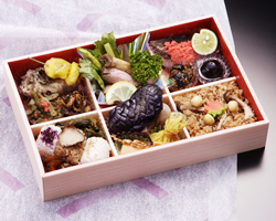 名神高速道路・多賀SAの速弁「花びわ娘」は琵琶湖の幸と近江の幸がたっぷり。地元の創作料亭「魚庄」が作っています。取り肴や酢の物、揚げ物、炊合せ、ご飯ものなど9つの美味を堪能しましょう。1980円