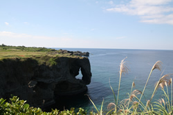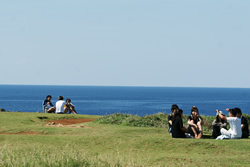 恩納村の観光スポット、万座毛は、断崖の上に天然芝が広がる。毛遊びのフィールドとして青年たちの憩いの場でもあった