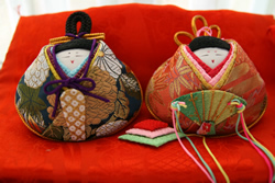 貝ガラにちりめんで装飾、ひな人形が完成