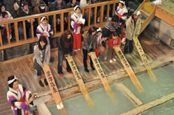 「湯もみショー」の開催時間は時期にもよるが、取材当日は日曜日で、10時、10時30分、11時の3回行なわれた。大人500円の入場券が必要。チェックアウト直後になるので、第1回目に見たほうが並ばずにすむ。湯もみ体験をすると草津の手ぬぐいがもらえるが、1回のショーで2回、計40名が体験できるようになっている。1階左右の浴槽入口付近に待機すると体験できる可能性大。