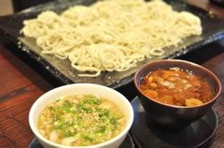 西の河原通りにある「三國家」の「三国そば」(950円)。板そばで更科系。2.5人前の分量がある。つけ汁は別売りで、都汁(醤油味)、田舎汁(味噌味)から選ぶ(ともに400円)。都汁は鴨南とラーメンのつけだれに似た味、田舎汁は赤だしベースの濃い目のけんちん汁のような味。