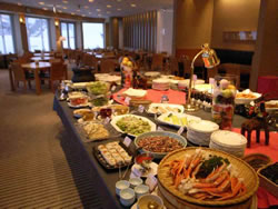 セントレジャー舞子ホテル 新潟県南魚沼市舞子2056-108 TEL:025-783-3511 URL:www.centleisure-maiko.com ゲレンデを青くライトアップすることで、山にいながらも海の中で食事をしているような演出を狙っている。 ホテルのバイキングもあなどれない。”スキー場にあるホテルのバイキングにうまいものは期待できない”という時代は変わりつつある。 セントレジャー舞子ホテルのディナーバイキングは、ズワイガニとローストビーフが目玉だ。バイキングなので当然いくらでも好きなものを食べることができる。ほかにも新潟特選ポークのしゃぶしゃぶや、へぎそばなど新潟ならではのうまいものが揃い、食事だけで40品目はある。ビジターでも3800円で食べられ、コストパフォーマンスが非常に高い。なかにはカニだけを皿に大盛りにする人もいるほどの盛況ぶりだ。