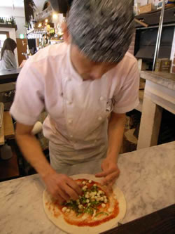 オーダーを受けてから手早く生地を伸ばす。ウッディなロッジの窓越しにゲレンデを見ながら食べる石窯ピッツァは格別の味だ。