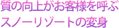 かつて冬のシーズンだけで1年分を稼ぐといわれたウィンターリゾートだがレジャーの多様化と不況により入場者数は大幅に減少した。しかし、サービスの質の向上によりいままた、新たな顧客を開拓しつつある。 |