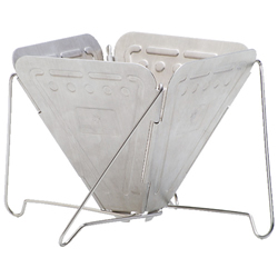 ![]() コンパクトに収納できるコーヒードリッパーは、キャンプだけでなくドライブのマストアイテム。車に忍ばせておきたい逸品。焚き火台の形をしたフォールディングコーヒードリッパーは2900円。スノーピーク製