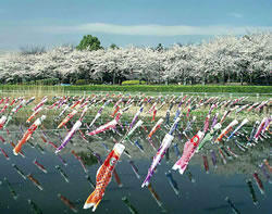 平成17年に5283匹の掲揚数でギネス世界記録に認定され、世界一の数を誇る鯉のぼりまつり。桜と鯉のぼりが同時に楽しめる。