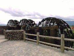 涼を求めて、筑後川沿いの清流と湧水の里に向かった。 筑後川は阿蘇山を源流とし、九州北部を東から西へ、久留米を経て有明海に注ぐ一級河川だ。今回の目的は、その筑後川沿いにある原鶴温泉と、その周辺の水をめぐる旅にあった。 福岡から九州自動車道を南へ向かう。鳥栖JCTは西の長崎、東の大分、南の熊本への分岐点となるため、とくに平日は太宰府付近から渋滞するルートとなっている。 博多駅から大分自動車道・朝倉ICまで約50分。高速を下り、国道386号線を筑後川に沿って東へ向かう。最初の目的地は「菱野三連水車」。 「はちみつの藤井」の看板に引き寄せられるように無料の駐車場に停める。ここは水車見学にはもってこいの駐車スペースで、庭園には蓮の花が咲き乱れていた。思いがけない光景にカメラを向ける。 園内を散策していると、あぜ道の向こうに木製の二連水車が姿を現した。 これが、日本で唯一現存する木製の重連水車群だ。 いまも現役で稼働している。 筑後川の氾濫による洪水を防ぎ、田畑に安定した水を供給するため、筑後川から支流の堀川を引き、約200年以上前の宝暦年間に水車をまわしはじめた。 少し上流に向かって歩くと、菱野三連水車が現れた。 ここには三連水車のほかに、三島二連水車、九重二連水車の3つの重連水車があり、平成2年に国指定の民俗文化財に指定されている。 実用的な水車を見たのはこれがはじめてだった。 水車の大きさは背丈ほどの高さしかないが、近づいたときの、この存在感はなんだ。 柄杓がぐんぐん水をくみ上げ、トイに流し込む。すごい水の勢いだ。 川幅を細くして水流を強くすると水車がまわり、三連の水車で1分間に6000リットルもの水をくみ上げる。 3つの重連水車では35ヘクタールの水田を潤している。 力強いだけでなく、機能的な美しさを兼ね備えた水車。 地元の農家の方がきちんとメンテナンスをし、使い続けてきたことが、今日の保存につながったのだろう。 6月中旬から10月中旬までの期間、断続的に休みはあるが、この夏も水車はまわり続けている。 |