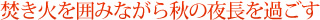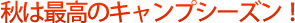 | 秋は一年で最高のキャンプシーズン。 清々しい大地のにおい、木々の香り、澄んだ青空。夜はランタンや焚き火でムード満点! |