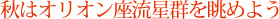 ![]() グルメはキノコ類や脂ののった魚介類がバーベキューを華やかに彩り、落ち葉や木の実を材料とするキャンプ場のクラフト教室では、子どもたちの嬉々とした声が森にこだまする。 キンモクセイの香りが漂うと、フィールドはすっかり秋本番の趣に変わり、秋空の下で“一年で最高のキャンプシーズン”を、それぞれのキャンパーが謳歌する。 そして秋と冬のフィールドを盛り上げるのは夜であり、何といっても焚き火がキーワードとなる。 焚き火を囲んで秋の味覚を楽しみ、酒を酌み交わす――。 昼は子どもが主役のフィールドも、夜になれば大人たちの贅沢な空間となり、虫の音色が小さな宴を盛り上げる。 ![]() もちろん秋や冬だけの“アウトドア”ではないが、名月とともに神秘的な世界を堪能するなら、これからのシーズンが天体観測のベストシーズンなのだ。 さて、今年は10月の最初の土曜日が中秋の名月となり、北海道や東北方面のフィールドでは紅葉とともに眺められる可能性が高い。 そして10月の天体観測といえばこちら。そう、オリオン座流星群である。今年は10月21日が極大となるといわれており、ピーク時には15個前後の流星が見られるかもしれない。 オリオン座の方向から流星が飛び出す様子は、いまでは秋の風物詩といったところ。 もちろん観測に最適な場所は、空が暗くて人工的な灯りのないところで、キャンプ場は格好のフィールドとなる。ぜひ皆さんも、キャンプ場で流星群を満喫してみてはいかがだろう。 |