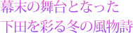 | 1853年(嘉永6年6月3日)、浦賀沖に4隻の艦隊が姿を現した。 これまで日本人が見たことのある帆船と異なり、モクモクと煙を吐く黒塗りの蒸気船で、船体の横には外輪がついている巨大な巡洋艦だ。 大きな大砲から、威嚇の空砲が発射された。第3代将軍徳川家光以来、200年続いた鎖国が解かれるきっかけとなったペリー艦隊の来航は、江戸に大きな衝撃を与えた。 開国を迫るペリーに対し、対応に困った幕府は1年の猶予をもらって一旦は引き揚げてもらう。 ペリーが江戸を離れたわずか10日後、将軍徳川家慶が死去。13代将軍には家定が就いたが、病弱で国政を担えるような器ではない。幕府の混乱を突き、ペリーは約束よりも半年早い嘉永7年1月に、再び浦賀に来航した。 1カ月にわたる協議の末、幕府はアメリカの開国要求を受け入れ、日米和親条約を締結する。下田と箱館(現在の函館)を開港し、鎖国体制は終止符を打った。下田は伊豆半島南部の東側に位置する。