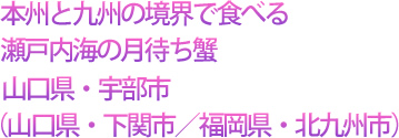 | 山口の冬の味といえば、なんといっても下関のフグが有名だ。 下関流にいえば「ふく」。縁起をかつぎ、フグではなく福(ふく)からきている。 毎年2月9日は「ふくの日」として恵比寿神社で祈願祭が行われる。また、2月11日の建国記念日には南風泊市場でジャンボふく鍋サービスのイベントが恒例だ。 だが、今回の旅の目的は、ふくではない。 瀬戸内海の西側には、山口から九州にかけて周防灘が広がっている。 この周防灘の名物に、「月待ち蟹」というカニがいるという。いったいどんなカニなのか。今回は関門橋を中心に、月待ち蟹を求めて旅に出た。