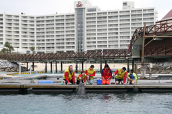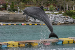 沖縄本島のほぼ中央、恩納村にあるリゾート施設ですが、ホテルに隣接して美しいビーチやドルフィン・ラグーンがあります。 ドルフィン・ラグーンではイルカが11頭飼育されています。 8頭はおなじみのバンドウイルカ、3頭は飼育が難しい沖縄近海などに棲息するマダライルカです。 鼻先が白く、やや小柄なマダライルカは見られるだけでも貴重なんですよ。 |