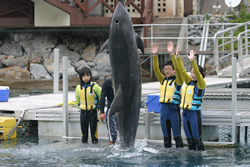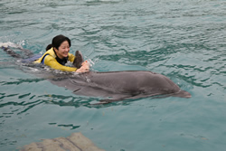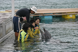 イルカも人間に触れられるのはうれしいのだそうで、トレーナーたちと毎日触れ合って、信頼関係を築き上げていくのでしょう。 「イルカは体温を保つ能力が優れています。だから、冷たい海の中でも体温をヒートアップさせています。反対に、海の外に出ているとオーバーヒートしてしまうんです」と、トレーナーさん。 実際に触ってみないと、イルカが温かいこと、柔らかいことはわかりません。海の中にいるのだし、魚を思い浮かべて冷たく、堅そうなイメージがあります。 実際にイルカに触れれば、そのイメージが間違っていたことがわかります。それを知るだけでも、ドルフィン・エンカウンターは素敵な体験です。 |