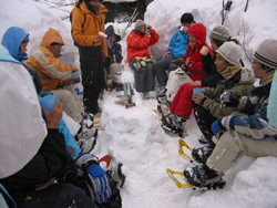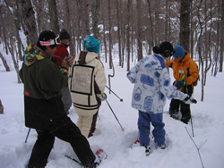 安比高原には自然をたっぷり遊ぶ「イーハトーヴォ安比高原自然学校」があり、文明さんはそこの校長も兼務しているのだった。 学校の雪山プログラムは豊富だ。「テレマークスキー」「スノーシュー」、幻想的な夜の森を探検する「ナイトプログラム」、子どもたちが野外体験できる「キッズプログラム」などなど。 安比高原に出かけた僕は、文明さん自らがガイドするスノーシューツアーに出かけた。 いわゆる“西洋かんじき”をつけて雪山をめぐるのだ。ウサギの足跡や、幹につけられたクマの爪跡など、アラスカで見たような自然が安比高原の森にも残っている。 雪に覆われているようでも、春に向けて新しい小さな芽が出ていたり……。雪山は新しい発見の宝庫なんでした。
