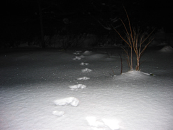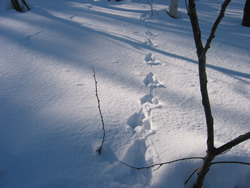 やがて、森林の山岳地帯に入り、太い木々をよけながら凸凹の雪を上ってゆく。 スタートしてから約3時間、視界が開けた丘の上に出た。正面にはマッキンレーの雄姿。あの感動は忘れられない。 このときに、もうひとつ感じたのが冬の自然のおもしろさだった。 木の幹にクマの爪跡を見つけたり、動物たちの足跡を追ったり、静かに閉ざされたように思える雪山にも、自然の息吹はたくさんあったのだった。 |