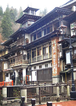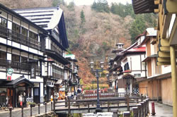 | 東日本の人気温泉地、銀山温泉。3階、4階建ての西洋風木造建築が現存し、 いまも大正ロマンの雰囲気を色濃く残す風情のある温泉街だ。 |