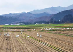 尾花沢には多くの白鳥が飛来し、田んぼにも姿を現す。銀山温泉と尾花沢市内の中間地点にある徳良湖は白鳥が冬の風物詩となっている