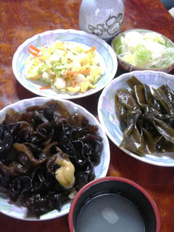 入口で番号札を渡され、人の合間を探して長テーブルにつくと、まず漬物や大根、昆布、きくらげなどの煮物が3品出てくる。これは食べ放題のメニューに含まれている