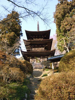 大法寺三重塔を石段の下から望む