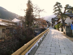 | 大法寺をあとにし、国道をふたたび松本方面へ向かう。 青木村役場を過ぎたところから左折して十観山方面へ5分ほど走ると、もうひとつの目的地、田沢温泉に到着する。 川沿いに木造の家屋が小ぢんまりと建ち並び、緩やかな石畳の勾配が真っすぐ続いている。