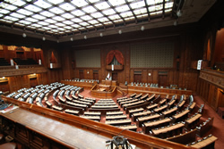 約450畳の衆議院議場。議長席の上には天皇陛下のお席、議席などは圧倒的な迫力です