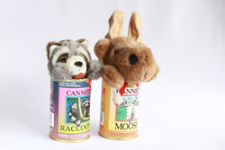 動物の缶詰の中身はかわいらしいぬいぐるみ。カナダで買ったアライグマとムースです