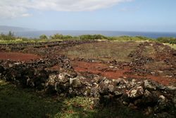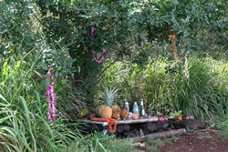 ヤシとユーカリの木の下には石が置かれています。「出産の痛みを和らげると同時に、ここで生まれると霊力を授かる」と言い伝えられている場所なのです。 現在では「子宝を望む人」が訪れ、その効果も十分にあるようです。石の上にフラワー・レイを飾り、「これで子どもができるだろう」と笑うロコに出会いました。 |