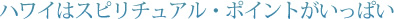 ノースショアにあるのは「プウ・オ・マカフ・ヘイアウ」と呼ばれる聖地です。ここは神々が集まる場所で、神聖な儀式が行われる場所。すぐ下の海はサーファーで賑わっているのに、わたしが訪ねたときは誰もいませんでした。それでも、小さな祭壇にはフラワー・レイやパイナップルなどの果物、ビール!が捧げられていました。 その場所に立つと眼下には美しい海が広がっています。青い海と青い空、そしてハワイの植物に囲まれた場所。そこで大きく深呼吸をすれば、東京で疲れていたハートに、新鮮な空気が吹き込まれ、パワーをもらった気分になりました。 そのほかハワイにはたくさんのパワーポイントがあります。ハワイ神話の火の女神・ペレが座った岩も東海岸にありますし、街の中にもハワイ王国時代の聖地の名残りがあります。 巨大観光地のハワイ・オアフ島で訪れたスピリチュアル・ポイント。そこはどこもわたしをとても開放的な気分にさせてくれました。スピリチュアル・ポイントを訪ねることで、またひと味違ったハワイを体験したのです。 それ以降、旅をするときにスピリチュアル・ポイントが気になり出しました。地球からパワーをもらい、身体も心も元気満々でいたいと思うようになったのです。 |