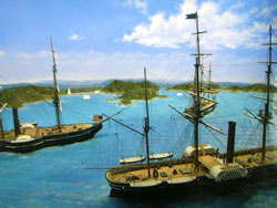所在地:神奈川県横須賀市久里浜7-14 TEL:046-834-7531 開館時間:9:00~16:30 休館日:月曜日(祝日のときは翌日)、年末年始 やはり、ここを訪れる観光客は、龍馬が黒船を目撃した設定に同様の疑問を抱いているようで、よく同じことを尋ねられるという。 「船があんなに近くに見られるはずはない」というのが常識的な結論なのだが、「もし龍馬が黒船を間近で見る可能性があったとすれば……」という話をしてくれた。 ペリーが1853年(嘉永6年6月3日)に来航した際、浦賀沖には4隻の艦隊があった。 旗艦「サスケハナ」(蒸気外輪フリゲート)、「ミシシッピ」(蒸気外輪フリゲート)、「サラトガ」(帆船)、「プリマス」(巡洋艦)。 開国の要求と同時に、ペリーは浦賀付近の測量を行っている。 そして6月6日には、幕府に対する威嚇行為もあって、ミシシッピが東京湾内を深く進んで測量をしている。もし龍馬が本当に蒸気船を見る機会があったとすれば、このタイミングではないだろうか、というのだ。 実際には、蒸気船自体はそれほど大きなものではなかっただろう。だが狂歌で「太平の眠りを覚ます上喜撰 たった四杯で夜も寝られず」とあるように、その存在感は、幕府を動かすのには十分だった。 龍馬は実際に目前で黒船を見たのか、彼が受けた印象や衝撃は大きいものだったのか。 正直なところ、それは測りかねる。 しかし、この黒船の到来により、日本はたくさんの若者を巻き込みながら、大きな転換期を迎えるのだ。 |