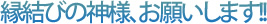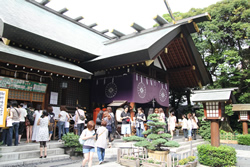 石のテーブルを囲んで縁結び絵馬になにやら真剣に書き込んでいる女性、縁結びおみくじを求めて行列を作る女性、お賽銭を奮発する女性、女性、女性……。 隣接する会館では神前結婚式のあとに披露宴を行っている新婚夫婦がいて、その艶やかな姿がまた参拝の女性たちの「縁結び御利益願望」をよりいっそう高め、興奮状態にさせています。 |