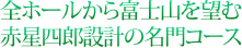 富士カントリークラブ 所在地:静岡県御殿場市東山2472番地 TEL:0550-82-1616 ホール:18ホール パー72 6771ヤード 開場:1958年 コース設計:赤星四郎 クラブハウス設計:アントニン・レーモンド ゲスト料金:平日約1万5000円~/土日祝約2万円~ (1ラウンド乗用カート・セルフ) 東名自動車道・御殿場ICから2km。高速道を出て3分でクラブハウスに着くという近さで、これほど都心からアクセスのいいゴルフ場はなかなかありません。 ここは、御殿場市で戦後もっとも早くできたゴルフクラブです。 富士裾野一帯は、戦後は米軍により接取されていましたが、勝又春一市長は米軍撤退後のことを考え、1956年(昭和31年)に、レクリエーショナル施設と地元とのコミュニケーション場としてゴルフ場建設を計画しました。 発起人には石橋湛山(首相)、安藤楢六(小田急電鉄初代社長)、石井光次郎(元副総理・岸総理時代)、瀬川美能留(野村證券社長)ら19名が名を連ねます。 1958年8月16日、18ホールが完成し、秩父宮妃殿下を招いて鍬入れ式が行われました。 ゴルフコースを設計したのは赤星四郎。 薩摩藩出身の政商・赤星弥之助の四男に当たります。赤星四郎は高校時代からアメリカへ留学し、プリンストン大学に学びます。大学ではアメリカンフットボールの選手でしたが、帰国後、発足して間もない東京ゴルフ倶楽部に入会。1926年(大正15年)の日本アマで初優勝を飾り、トップアマとしてだけではなく、コース設計家としても活躍。日本でゴルフの普及に努めた重要人物のひとりです。 赤星四郎の設計したコースには、程ヶ谷カントリークラブ(大正12年)、霞ヶ関カンツリー倶楽部東コース(昭和4年)、箱根カントリー倶楽部(昭和29年)などがあります。 丘陵地の傾斜や細やかなアンジュレーション(起伏)がそのまま残され、自然の景観を生かしたコース設計になっているのが特徴です。 クラブハウスを設計したのはアントニン・レーモンド。旧帝国ホテルを手がけたフランク・ロイド・ライトの右腕として来日しました。レーモンドの門下生には前川國男や吉村順三がおり、日本の建築家にも大きな影響を与えたモダニズム建築の泰斗です。