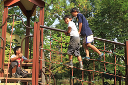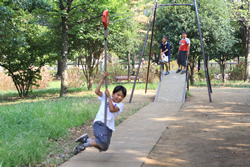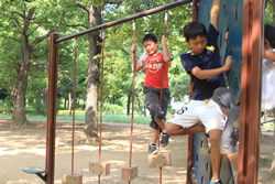 | みんなで汗をかき、ときには泥まみれになって遊んでいるファミリーをよく見かけます。まさに「わんぱく家族」、子どもも大人も一緒に遊ぶっていいですね。そんな家族にもってこいのフィールドがアスレチックです! |