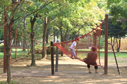 す、すごい。つくし野のフィールドアスレチックは丸太とロープが巧みに使われており、ポイントも大掛かり。池の上のポイントや、土を利用したポイントもある。彼女が失敗して濡れてしまったのもうなずける。 だって、ホームページの注意書きにも「汗をかいたり、または転倒、池への転落が予想されるので着替えを用意しましょう」とあるもの。ハードさがうかがえる。 でも、レンタルジャージもシャワーもあるから、最初からドロドロになる覚悟で行ったらいいかもしれないけど。 さっそく今度の休日に行ってみよう、と。 |