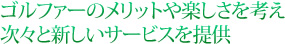 所在地:栃木県佐野市越名町2058 TEL:0283-20-5800 営業時間:10:00~20:00(レストランは11:00~21:00) 休業日:年1回2月第3木曜日 ゴルフ場から約30分という利便性を生かし、夫婦でゴルフ場を活用してもらうという方向性を探っています。 また、“健康ゴルフ”と銘打ったプレーも10月初旬よりスタートしています。 専門家の指導により、プレー前に肩甲骨と股関節を中心にしたストレッチ、プレー後にはクールダウンのストレッチを取り入れ、ランチでは特別な健康ジュースを提供するというもの。 アスリート向けとしては、ツアープロの気分を味わってもらうために、プレーヤー一人ひとりにバッグを担ぐキャディをつけ、カートを使わずにラウンドする企画が進んでいます。こちらは11月から実施の予定です。 これまでどのゴルフ場もやってこなかったようなサービスを、より細やかに提供する。 顧客目線に立ったゴルフ場の新たなサービスが、今後大きなうねりとなって広がっていくことを期待したいものです。 |