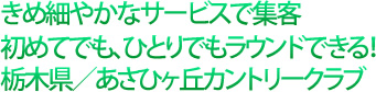 | ゴルフに詳しい友人がいないために、まだゴルフ場でラウンドしたことのないビギナーでも、気軽にひとりでラウンドできるゴルフ場があるんです。あさひヶ丘カントリークラブでは、初めてでも、ひとりでも、プレーアテンダントが無料でラウンドをサポートしてくれます。 |