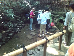 すると、「今日は空いていますよ」とのこと。それでも“整理券”が配られています。今や清正井を訪ねるには整理券が必要なのです。パワースポット・ブームの威力を知りました。 清正井の湧水によってできる南池、菖蒲田などを眺めながら清正井をめざします。 休日だったら行列が続く森の道。しかし、スイスイと進めます。 警備員の人に整理券を渡すポイントもスイスイ。