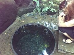 最後は階段を下りて清正井とご対面。そこに5、6人が待っているだけでした。 待ち時間3分!わぉ! 行く時期を選べば、森の中の散策を楽しんでいるうちに清正井に到着できます。火曜日の昼下がりは正解でした。 清正井には清らかな水がありました。 本当なら手で清水に触れてみたい!でも、この日は「都合により触れること、飲用は禁止」とのこと。 残念な気持ちで写真撮影だけして後にしました。帰りがけに警備員に聞くと、「雨が降っていないから湧水の量が少なくて……」とのこと。