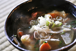 熊本県のみならず、九州地方で愛されている鍋料理 「だご汁」 材料(4人前) 里芋(大きめのもの)8個、鶏肉2枚、にんじん1/2本、しいたけ8枚、ごぼう1本、油揚げ2枚、長ねぎ1本、だし汁適量、味噌適量(だごの材料) 中力粉200g、水1/2の3カップ、塩小さじ1/2
