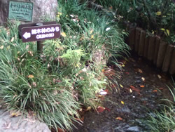 雑木林のみちへの案内板と小川。ホタルが棲んでいます