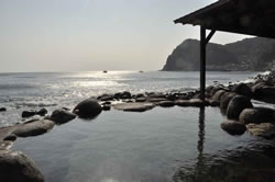 伊豆熱川温泉 高磯の湯 所在地:静岡県賀茂郡東伊豆町熱川温泉 TEL:0557-23-1505(熱川温泉観光協会) 入浴料金:大人600円、小人(4歳~小学生)300円 (夏季はプールと併用・大人700円、小人350円) 営業時間:9:30~17:00 泉質:ナトリウム-塩化物・硫酸塩温泉(低張性・弱アルカリ性・高温泉) 源泉:99.9度 正面には数隻の漁船。 その先に、かすかにぼやけた陸のシルエットが見える。 あれがアメリカ大陸か……。 そんなわけはない。あれは大島の三原山だ。 加水も加温もされていない、やや熱めの源泉かけ流しの湯。 ほとんど無味無臭でキシキシ感もトロトロ感もないが、たしかにカラダの芯から温まり、湯力が感じられる。 男性の脱衣所は丸見えで、女性専用の湯船は男性の露天風呂を横切った先にある。日中女性が混浴に入るには勇気がいるだろう。 とはいえ、波打ち際の露天風呂に入りながら朝日を眺める贅沢は、ここでしか味わえない。 東伊豆の初日の出の時間は7時少し前。 御来光を楽しみに来る旅行客も少なくない。 観光協会のホームページによれば、この温泉は昭和の初めに潜水名人の漁師によって発見されたという。 地元の人に野天風呂として開放されたほかは、戦後3年ばかり、塩工場として温泉が利用された。 1949年(昭和24)8月31日、大型で強い台風10号が小田原市を直撃。死者135名、行方不明者25名、負傷者479名の被害をもたらした「キティ台風」により、北川の塩工場は流されてしまった。 だが、これが契機となって温泉旅館が開業されることになり、温泉地としての歴史がはじまるのである。 ![]() 北川温泉から国道135号線を伊東方面に戻ると、大川温泉の看板が。土管の通路(!)で国道の下をくぐり抜けると、海沿いに小さな秘湯の建物がある。かつては露天の湯船だけだったが、18年前ごろから管理棟が設けられ、きちんと料金を支払う。平日の昼は女性客がほとんど来ないので、管理するおかあさんの粋なはからいでカップルだけで貸切風呂にしてくれることも