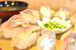 大川温泉露天風呂 磯の湯 所在地:静岡県賀茂郡東伊豆町大川温泉 TEL:0557-22-0248(伊豆大川温泉観光協会) 入浴料金:500円 営業時間:11:00~18:00(8月・土日祝~20:00) 泉質:ナトリウム・カルシウム-塩化物・硫酸塩泉(低張性・中性・高温泉) 源泉:73.3度 1年を通して食べられる鯵も、伊豆ならではの食材。北川温泉の郷土料理として、「北川あじ鮨」が7軒の宿と店で食べられる。 北川沖で獲れたばかりの鯵を使っていること、ひと口サイズであることという決まりがあり、店によって薬味にも工夫が凝らされている。 お昼どきに「食事処磯辺」で食べた「北川あじ鮨」は、シャリとネタの間にガリ(しょうが)、シソの葉が挟み込まれ、お好みで小ネギを載せて食べるというもの。シンプルだが鯵のうまさがダイレクトに伝わってきた。 宿によっては入浴料とセットで予約が必要なところもあるので、事前に調べてから行ったほうがいいだろう。 |
