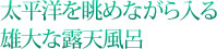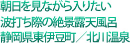 | 東伊豆には、広大な太平洋を見ながら入れる、海沿いの3つの露天風呂がある。大川、北川、熱川と温泉地は異なるが、波打ち際の絶景露天風呂はどれも個性的だ。 |