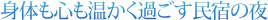 | 外に出るのがなんとなくためらわれる寒い季節。この時期のお出かけ体験は、「民宿泊」がおすすめ。おじいちゃん、おばあちゃんが都会に住んでいる子どもたちにとって、民宿のおじちゃんおばちゃんは、第二の故郷になってくれるだろう。 |