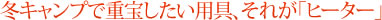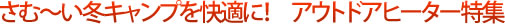 | 冬のキャンプといえば"いかに寒さをしのぐか"がポイント。そこでシュラフやテントなど冬仕様の用具に変えるのも大切だけど、より暖かくしてくれるヒーターの存在を忘れてはいけません! 今回は冷える足元、体を温めてくれる最新アウトドア用ヒーターをご紹介します。 |