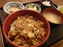 人情深川ご利益通りにある「六衛門」の深川丼セット。あさり、ネギ、厚揚げなどをミリン、酒、醤油で煮込んでご飯の上にかけた特製丼です