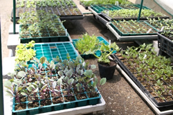 さまざまな野菜の苗。畑に丁寧に植えていく
